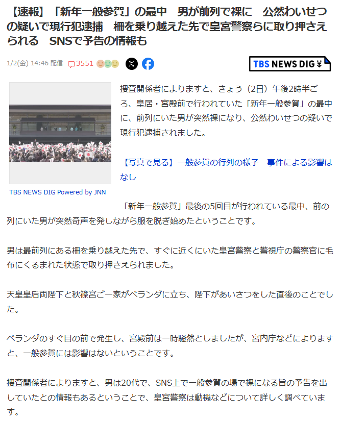 | 000458 | 「新年一般参賀」の最中 男が前列で裸に 猛者の集い(五条悟は俺が殺した) | 2026/01/04 13:55:12 |
